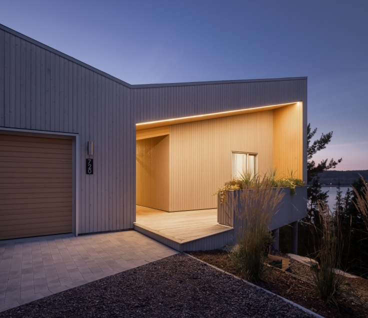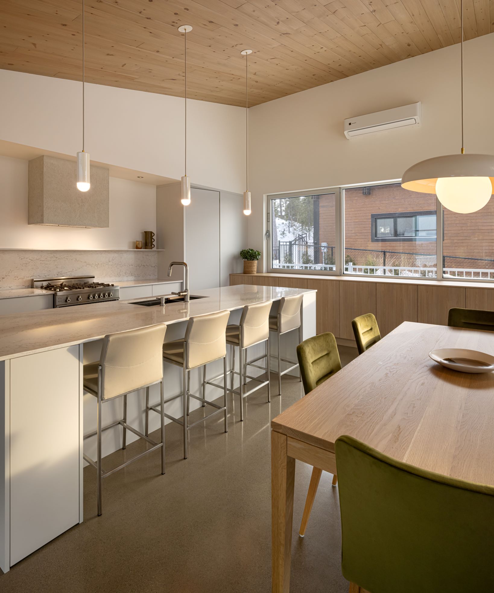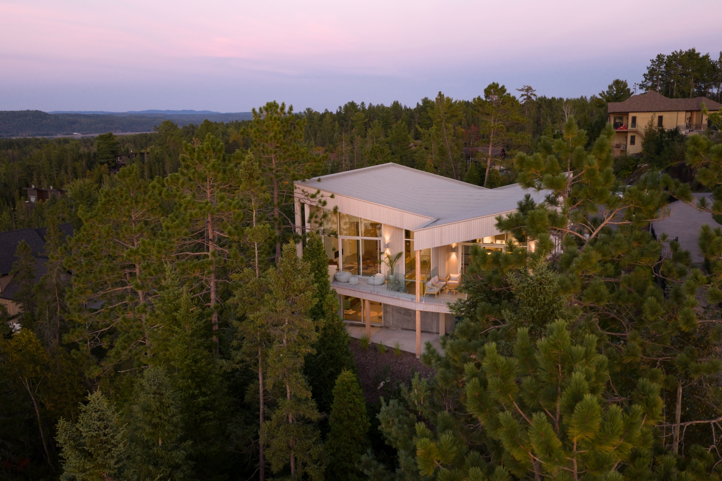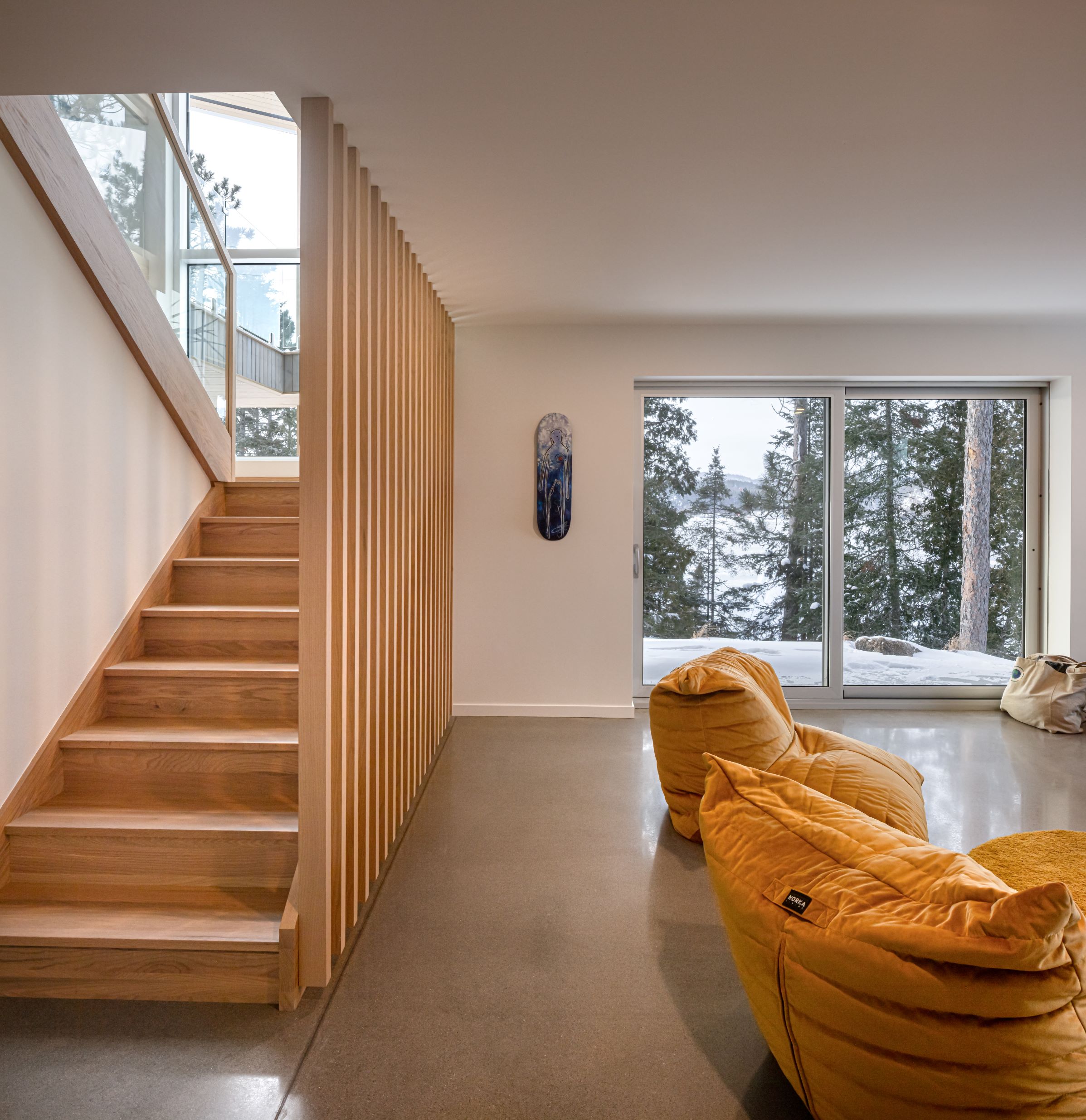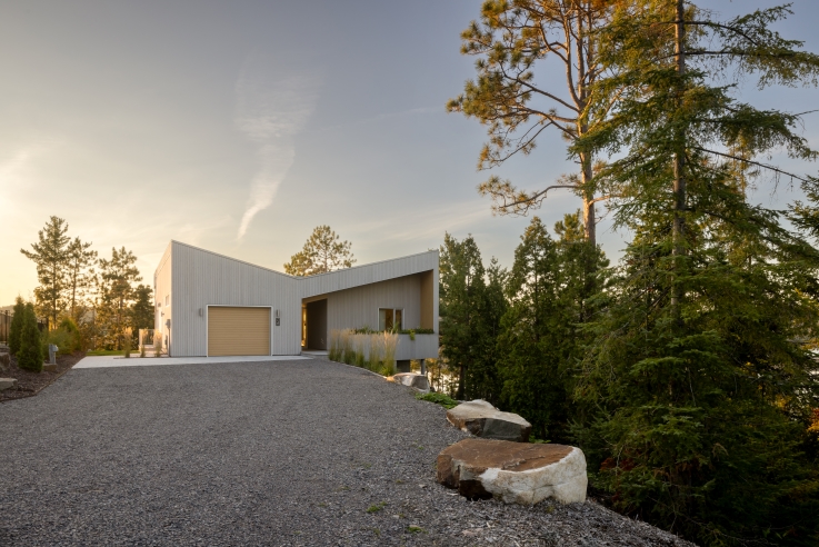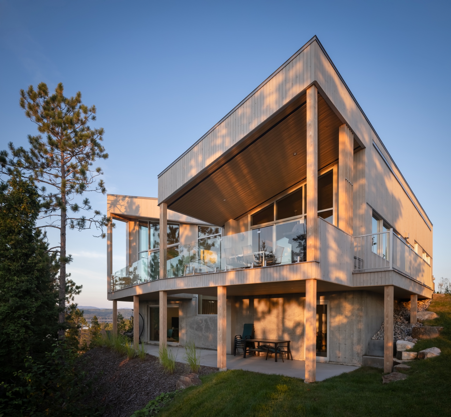 Cette résidence a été conçue afin de s’intégrer harmonieusement dans son environnement naturel. Le plan comporte un rez-de-chaussée et un rez-de-jardin afin de suivre la topographie naturelle du site. Les vues exceptionnelles sur 180 degrés du centre-ville de Chicoutimi, de la rivière Saguenay et des Monts-Valin sont mises en valeur par la grande fenestration telle une envolée qui inondera les intérieurs de lumière. La volumétrie de la résidence présente des lignes épurées et des formes minimalistes. Les terrasses et les vues vers l’extérieur permettront aux résidents de rester en contact avec la nature, quelles que soient les saisons.